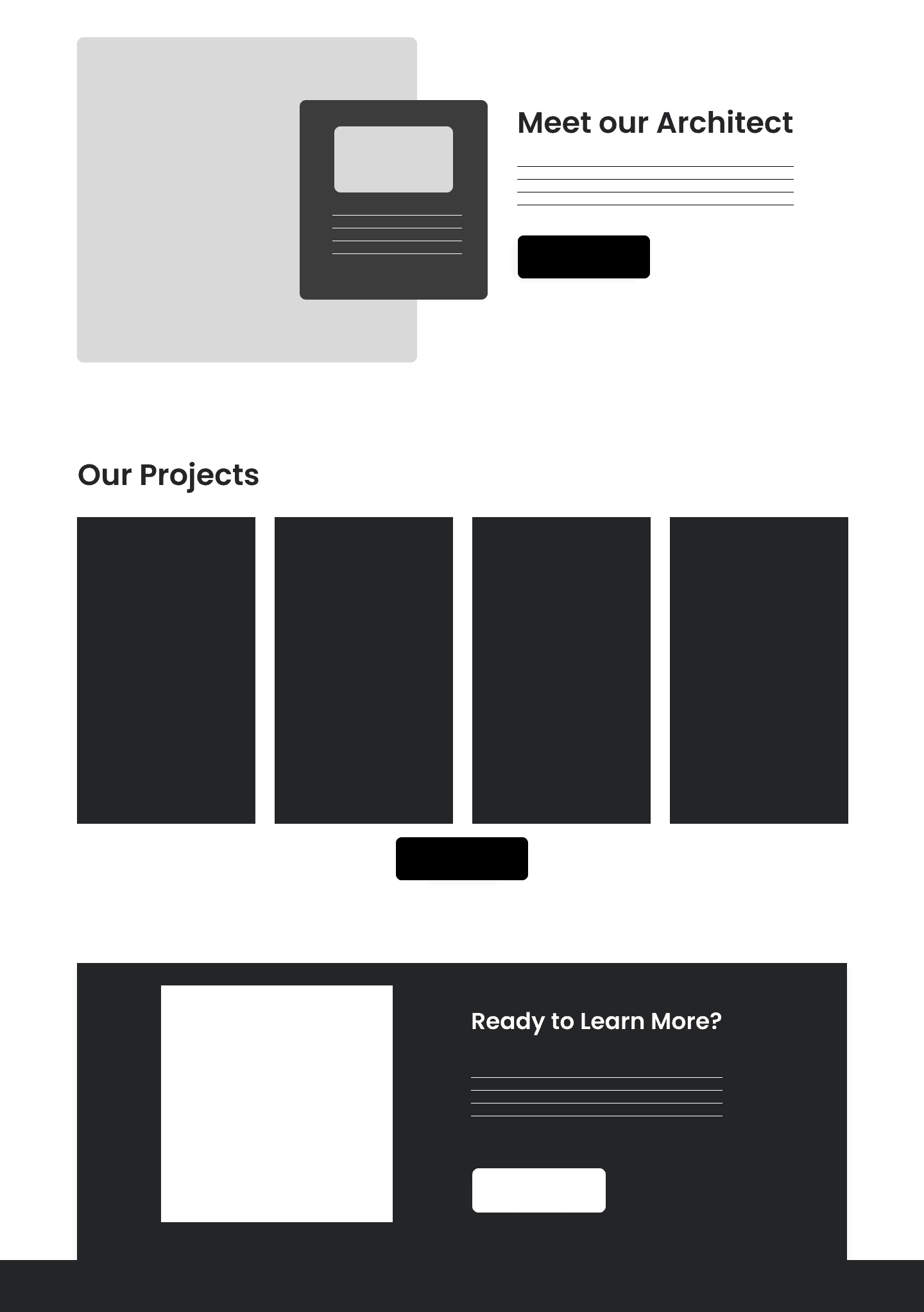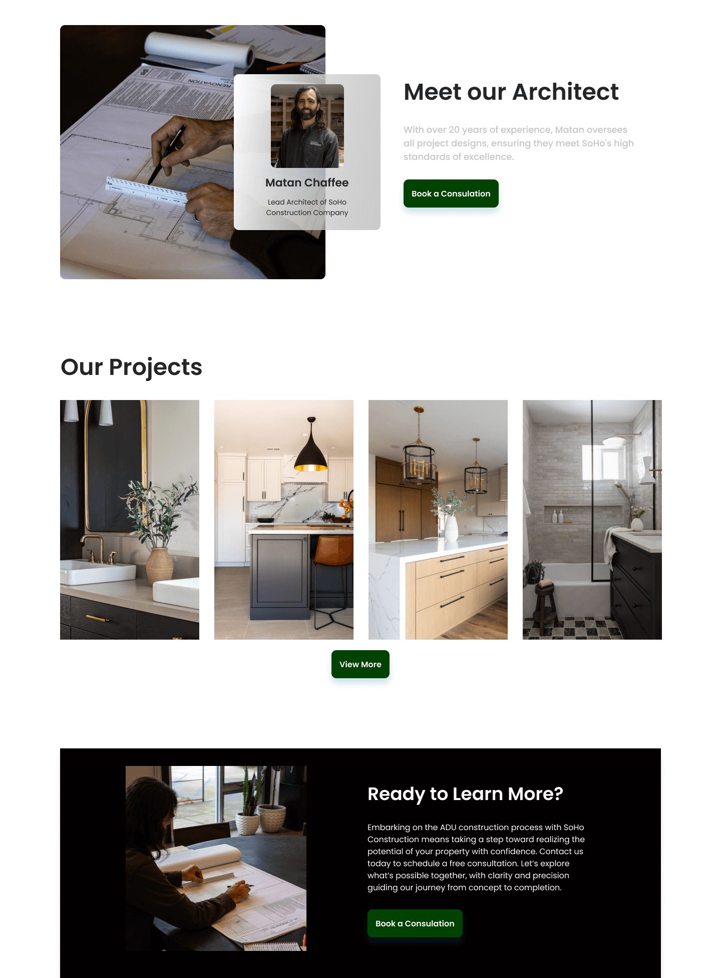 Introduced a personal touch by featuring our in-house architect near the end of the page, adding warmth and credibility. Followed it with a soft project gallery to show the quality of our work without overwhelming the user or shifting focus from the main content.