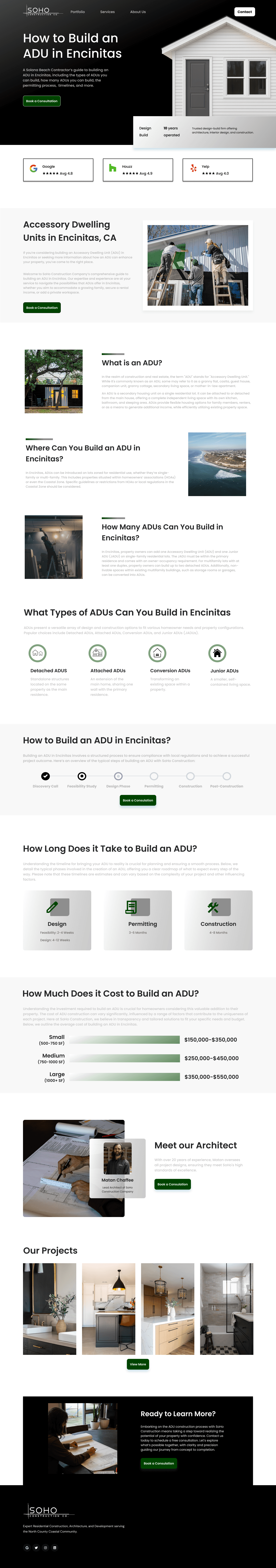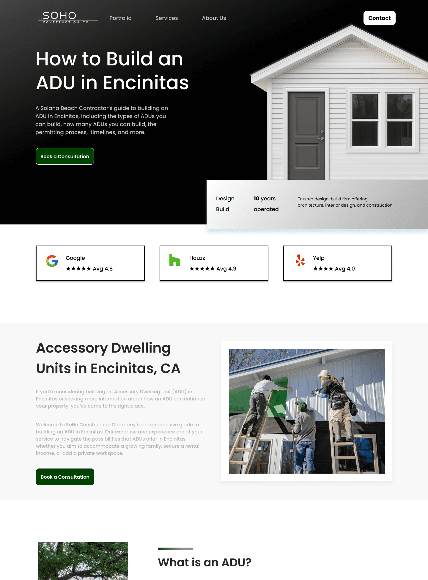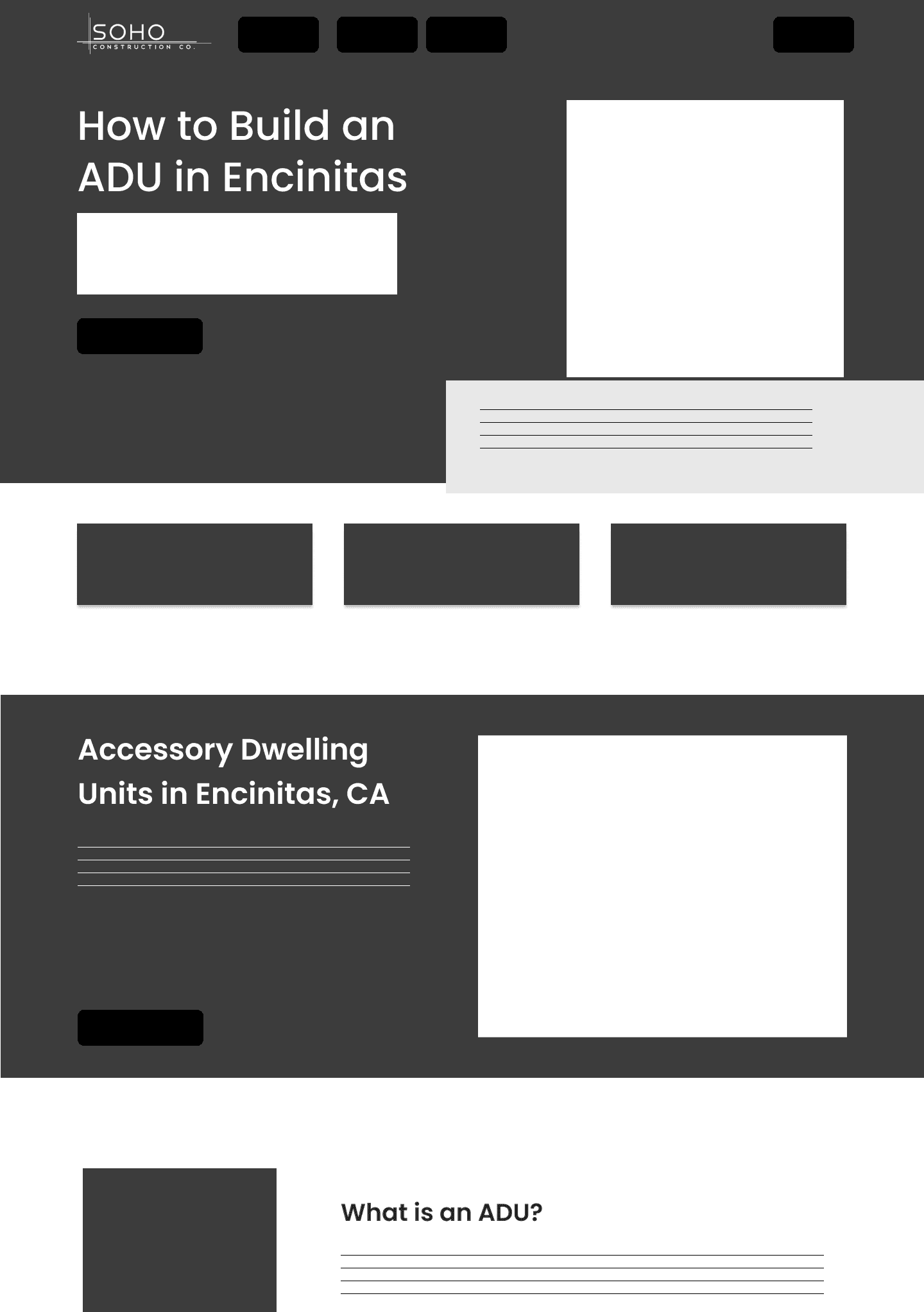 As part of Soho Construction's marketing team, I was tasked with improving the performance of our ADU (Accessory Dwelling Unit) landing page. The original page was dense and text-heavy, making it difficult for users to understand what an ADU is, if they qualify, and how to get started.