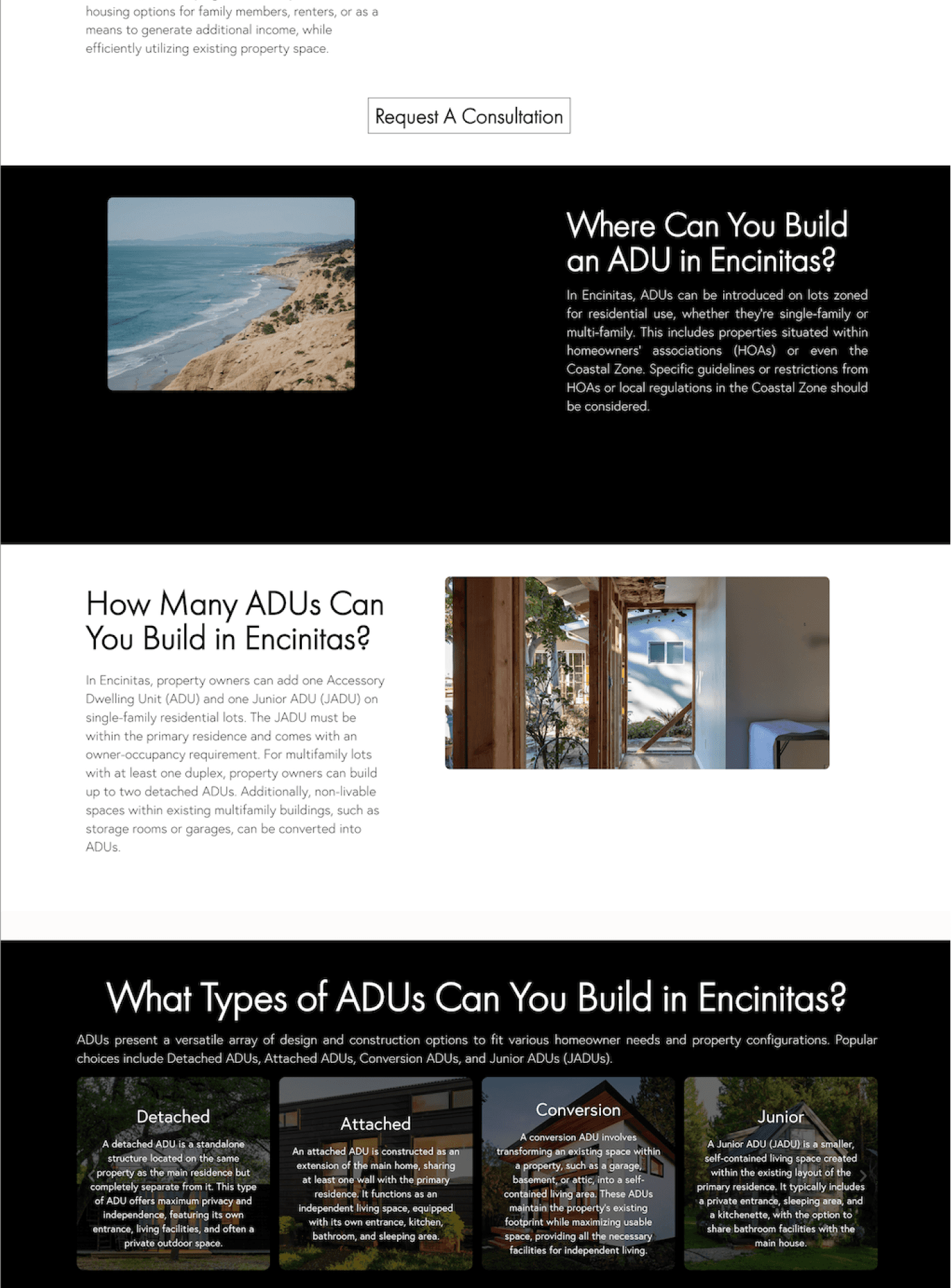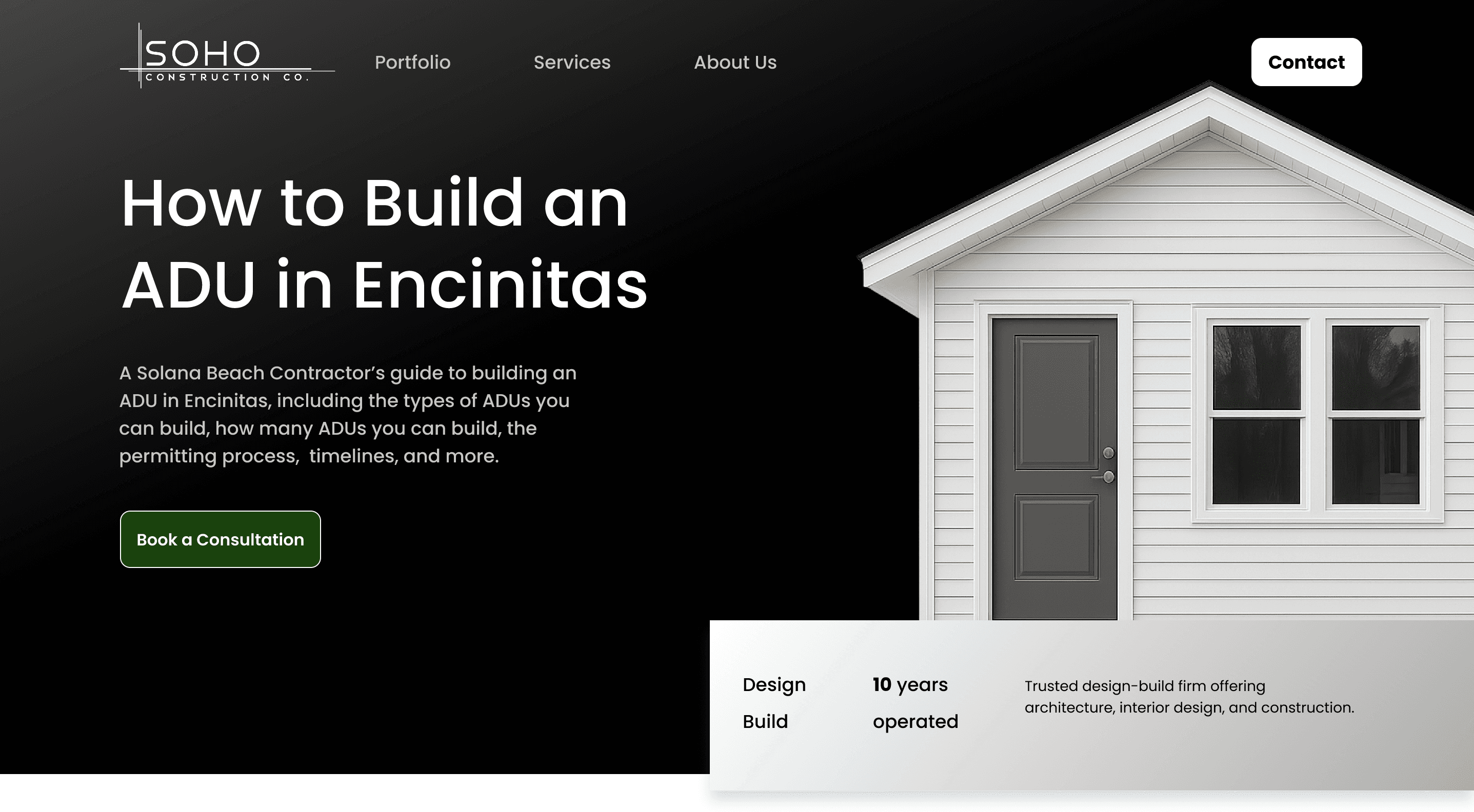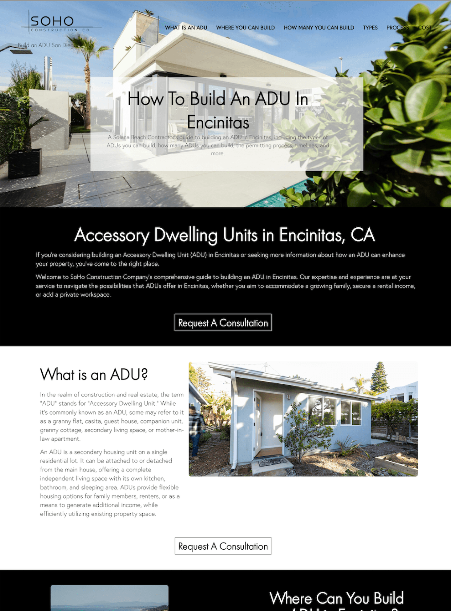 As part of Soho Construction's marketing team, I was tasked with improving the performance of our ADU (Accessory Dwelling Unit) landing page. The original page was dense and text-heavy, making it difficult for users to understand what an ADU is, if they qualify, and how to get started.