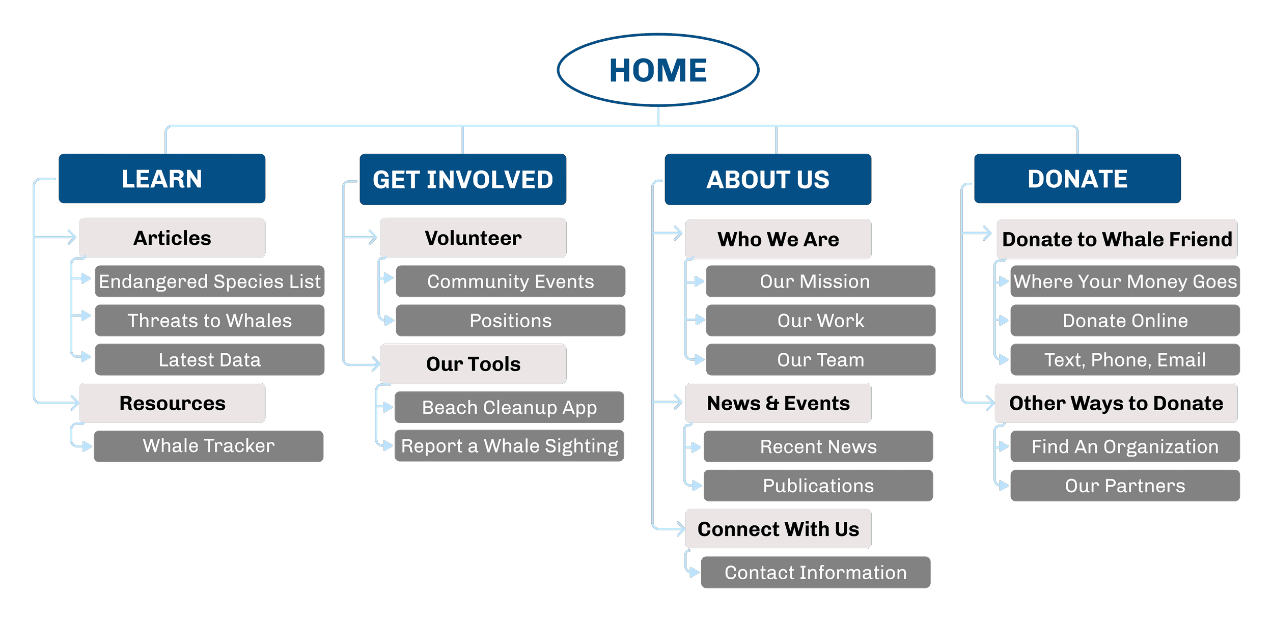 I began planning the information architecture for the Whale Friend responsive website by creating a hierarchical sitemap. I recalled important information about my target users and narrowed down elements to include on the website accordingly.