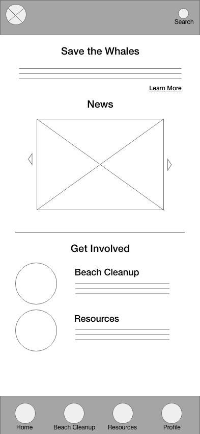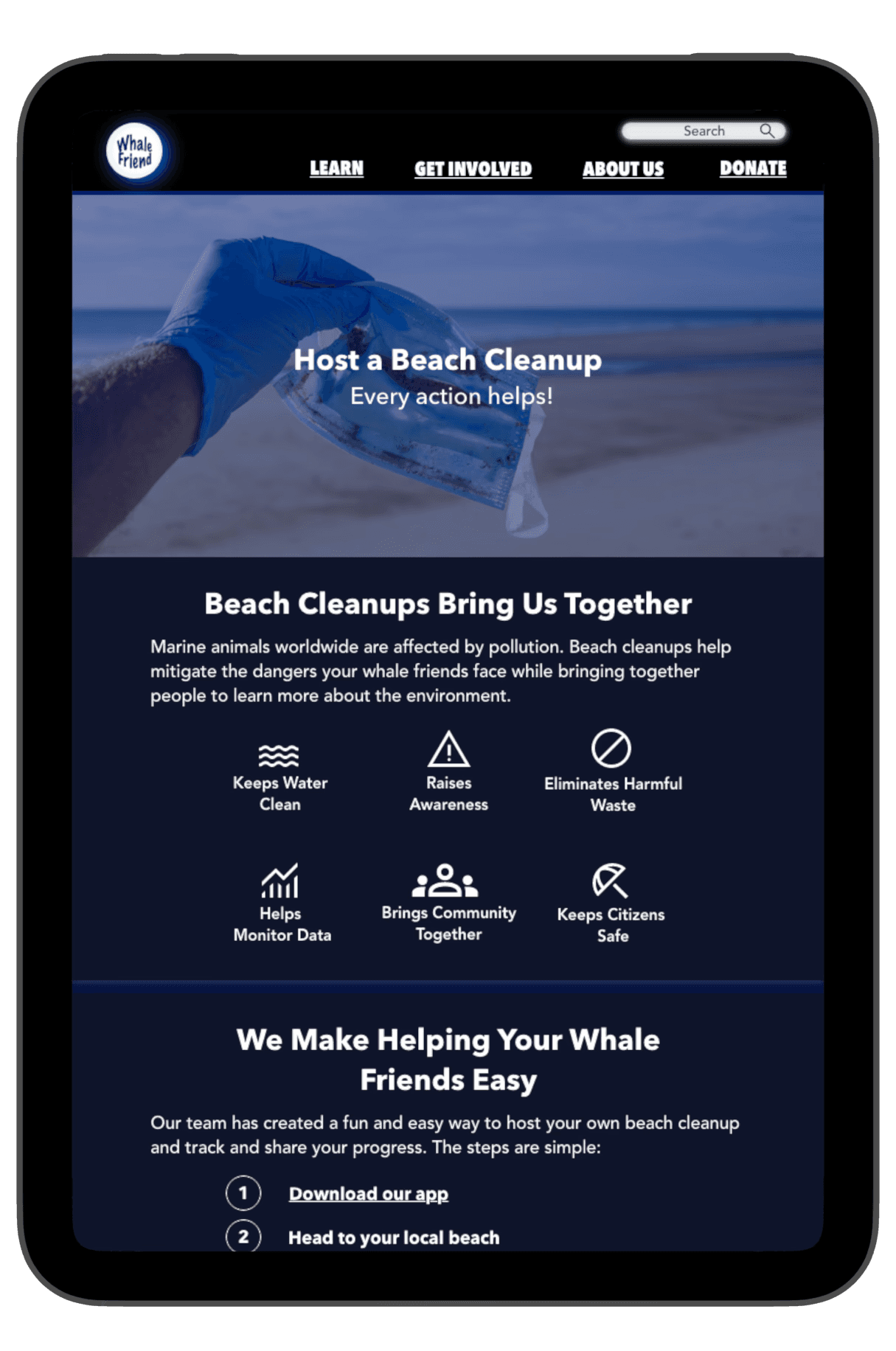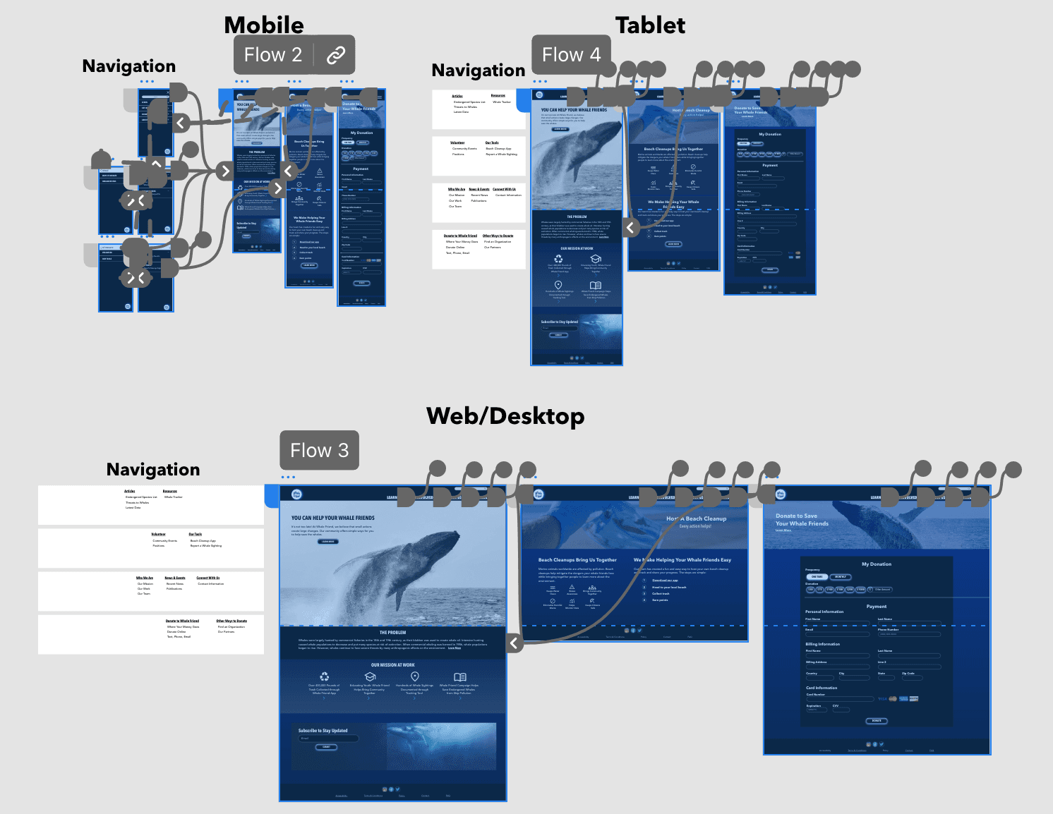 After completing mockups for the mobile version of the Whale Friend website, I proceeded to complete mockups for a tablet version and a desktop version. I then connected all screens to create three different prototypes for testing.