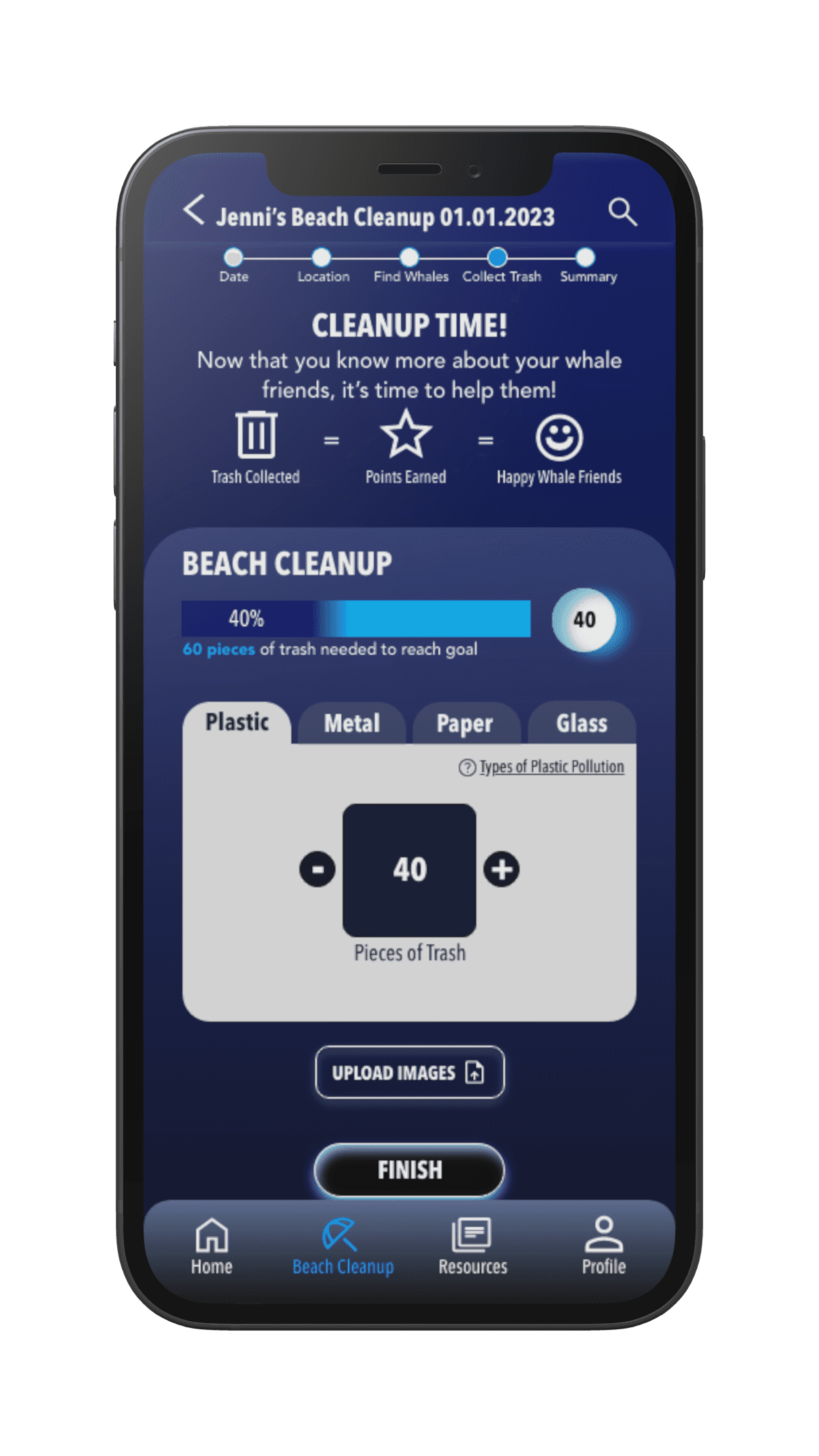 Types of trash are separated into four categories: Plastic, Metal, Paper and Glass. Users can input pieces of trash manually or click the plus or minus buttons for added convenience. As users add more trash, they collect more points. Pop-up windows appear throughout the activity with fun facts and thank you messages told from the perspective of a whale, which aims to motivate users to continue the activity.