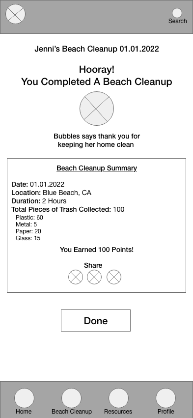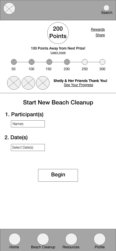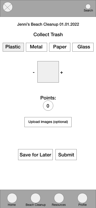 I drafted initial wireframes and created a low-fidelity prototype for the main user flow: hosting a beach cleanup. Users were prompted to input their name, the date, the location of the beach, and the amount of trash collected at the beach. I created a point system to motivate users to collect more trash and host more beach cleanups.