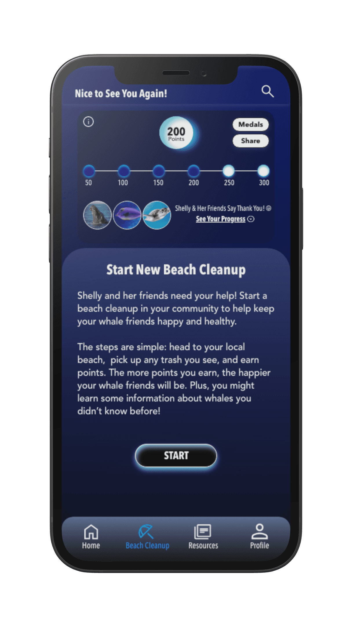 Starting a beach cleanup is easy and accessible, with the beach cleanup button located right on the main navigation bar. Brief instructions are displayed to help new users navigate through the activity. A point system with medals is presented on both the home screen and beach cleanup page to help motivate users.