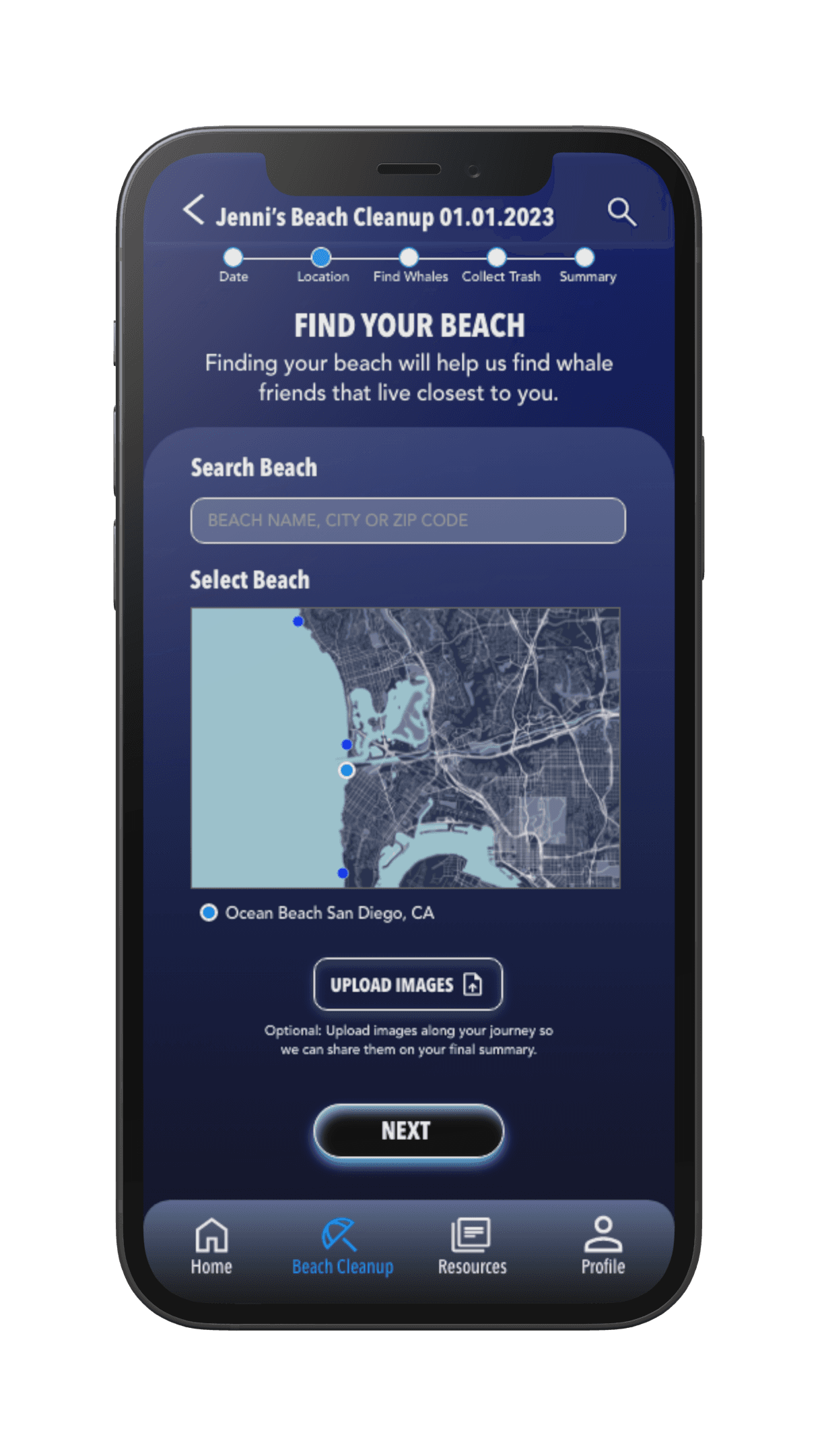 Users can easily locate their beach by inputting the name of the beach, city, zip code, or by clicking on the map. Once the location is found, a list of whales nearby is generated with a brief description of their characteristics and level of endangerment. Learning about specific whales nearby shows users how their actions are directly helping life around them.