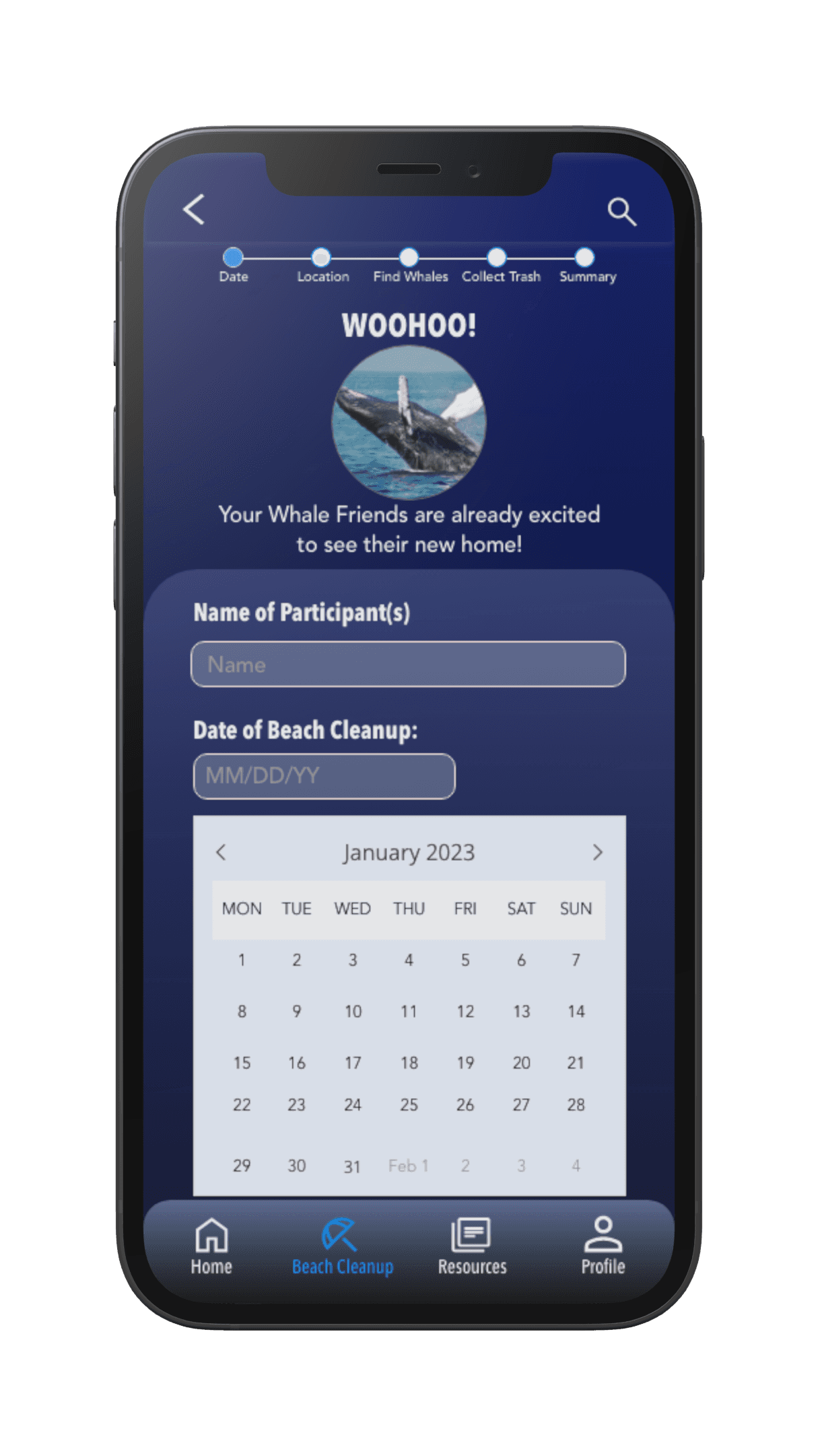 Adding the name of participants and the date of the beach cleanup creates a more personalized experience. The user is referred to by his/her/their name throughout the rest of the activity, as if the whales are speaking to them directly. The calendar creates a quicker and more efficient process.